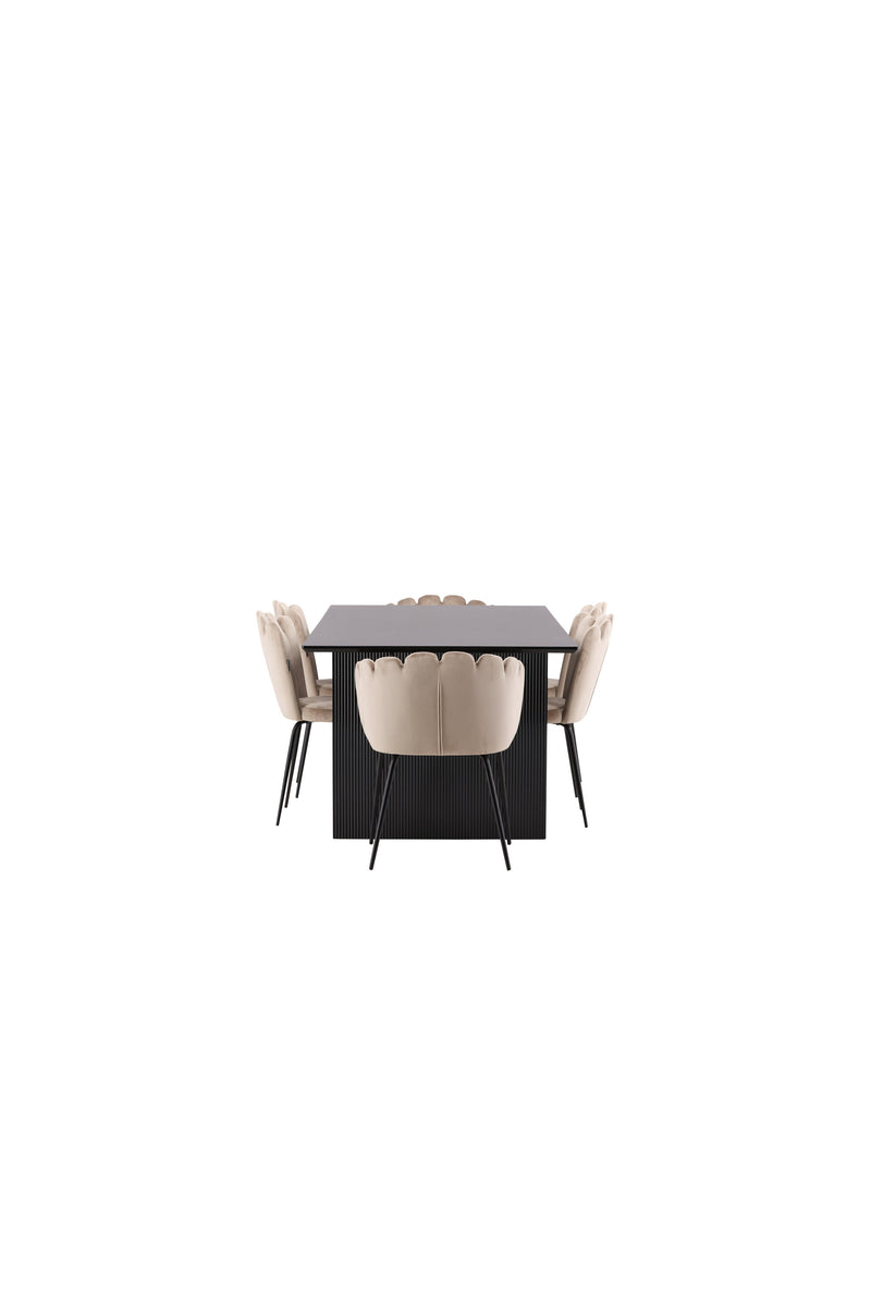 Der Leone Esszimmerstuhl und der Andy Esstisch bilden zusammen das perfekte Esszimmer-Set, das Stil und Komfort auf elegante Weise vereint. Der Stuhl ist FSC®-zertifiziert (FSC®C177288), was bedeutet, dass er aus Holz verantwortungsvoller Forstwirtschaft besteht, einer Forstwirtschaft, die Menschen und Umwelt berücksichtigt. Leone besteht aus weichem Samt mit Stahlbeinen und bietet ein perfektes Gleichgewicht zwischen Funktion und Ästhetik. Die weiche Beige-Farbe verleiht ein warmes und einladendes Gefühl, und das einfache Design macht den Stuhl vielseitig und geeignet für verschiedene Einrichtungsstile. Leone erleichtert es, eine einheitliche und harmonische Atmosphäre um Ihren Essbereich zu schaffen, sei es für den täglichen Gebrauch oder besondere Anlässe. Der Andy Esstisch mit seiner Whitewash-Farbe schafft ein erdiges und neutrales Gefühl in Ihrem Esszimmer oder Ihrer Küche. Die Stahlbeine und die Tischplatte aus MDF verbinden Eleganz mit Robustheit und machen ihn zu einem zuverlässigen Möbelstück für viele Jahre. Mit großzügigen Maßen von 180x90 cm bietet der Tisch ausreichend Platz, damit Familie und Freunde sich versammeln und gutes Essen sowie Gesellschaft genießen können. Zusammen bieten der Leone Esszimmerstuhl und der Andy Esstisch eine stilvolle und funktionale Lösung für Ihr Zuhause und machen jede Mahlzeit zu einem angenehmen Erlebnis. Geben Sie Ihrer Einrichtung einen Hauch simpler Eleganz mit diesem zeitlosen Esszimmer-Set.